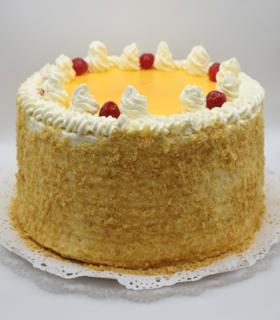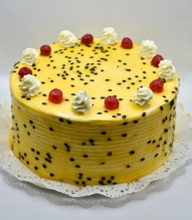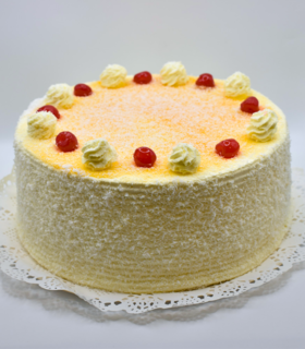 Bizcocho blanco, remojo de coco tres leche, rellena de piña en trozo, crema de coco con pulpa de maracuyá y mango.