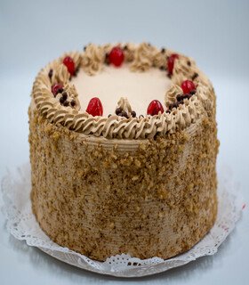 Bizcocho blanco, crema de café, damasco y nuez picada.