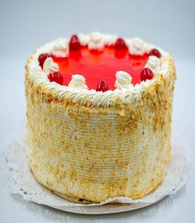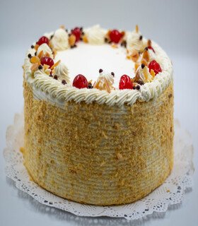 Bizcocho blanco, mil hojas, bizcocho de chocolate, manjar, crema pastelera, guinda, frambuesa, salsa de frutilla damasco y mango.