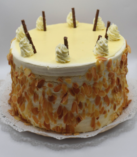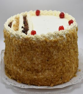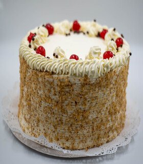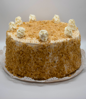 Bizcocho de nuez, manjar crema, disco de merengue seco y crema pastelera