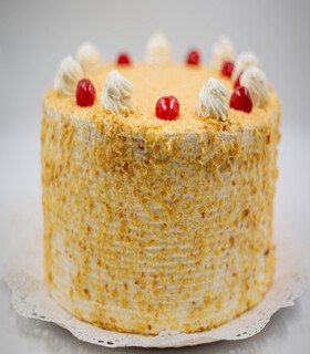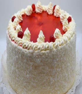 Bizcocho blanco, crema sabor a coco, piña picada y crenfil de coco.