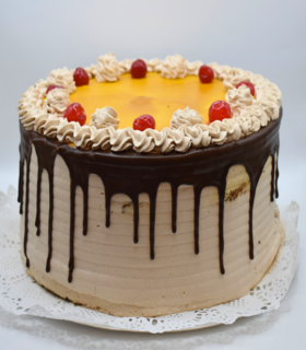 Bizcocho blanco , remojo 3 leche , rellena de crema pastelera, durazno, mango y crema