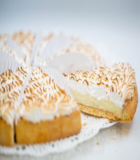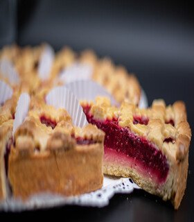 Base de masa azucarada, crema pastelera y compota de frambuesa.
