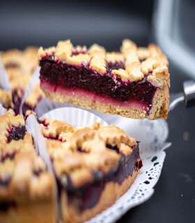 Base de masa azucarada, salsa de arándanos y migas