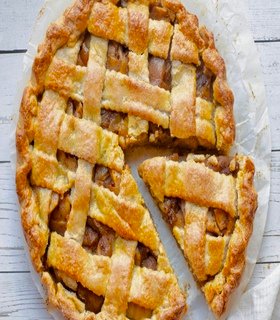 Base de masa azucarada, manzana en trozos salteada con toques de limón, vainilla y crema pastelera