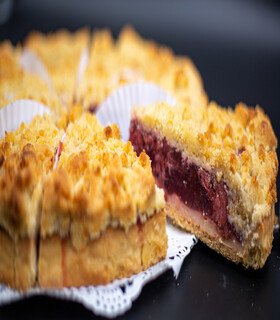 Base de masa azucarada con crema de mantequilla, salsa de frutilla y migas crujiente