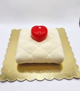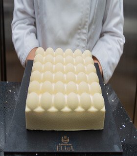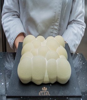 Mousse de chocolate blanco con toques de lima limón, suave insert de jalea exótica maracuyá, mango, bizcocho de coco al vapor.