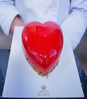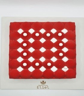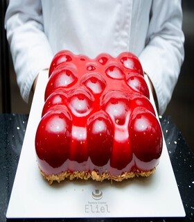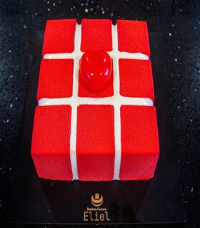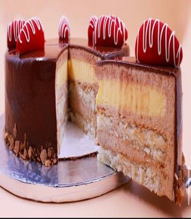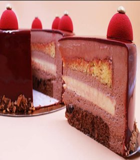Mousse caribeño, bizcocho esponjoso de chocolate, kiroh de chocolate cremoso y gelatina de cereza.