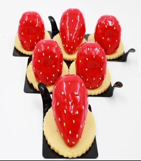 Mousse de frutilla, compota de frutilla y albaca, curd de mango perfumado con pomelo rica rica con base esponja de almendra