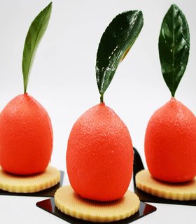 Mousse de naranja, mermelada de mango maracuyá y cilantro, esponja de almendra, base de pate sucrée
