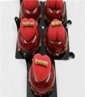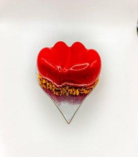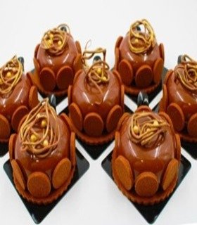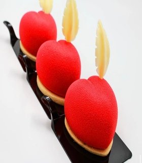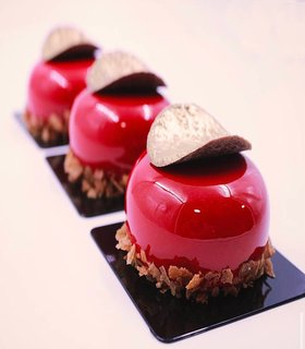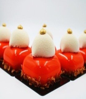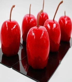 Nata de manzana, ganache de manzana, relleno de manzana eneldo, compota de manzana, baño de chocolate crocante glaseado rojo.