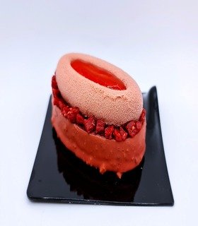 masa sable , francipane de almendra y frambuesa , con crema diplomática y gel de frambuesa