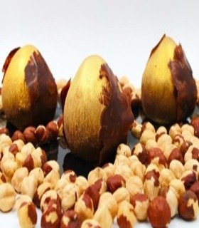 Nata montada de avellana, suave caramelo cremoso, praliné de avellana, corteza de chocolate de leche, suave esponja de avellana y escama de cobertura dark