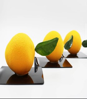 Ganache de limón, limón confitado, caviar de limón, gel de limón, menta fresca y cobertura de chocolate