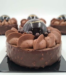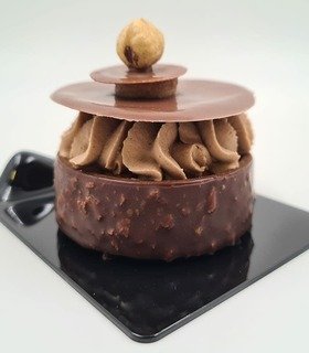 Masa sable cacao, bizcocho de avellana , ganache montada de avellana, cremoso de praliné, praliné de avellana y avellanas tostadas