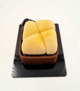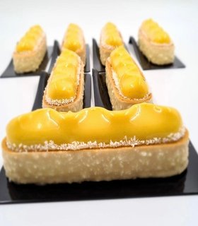Masa sable con baño de chocolate blanco y coco, gleificado de mango maracuyá, cremoso mango y maracuyá.