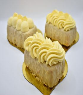contiene bizcocho de limón relleno de compota de frambuesa un baño Rocher con cremoso de limón con decoración de gel de limón