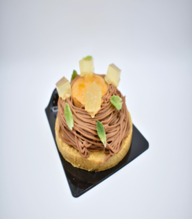 Masa sable cacao, baño Chocolate Rocher, frangipane de cacao y naranja, compota de naranja, ganache montado de bitter, cremoso de naranja y bañado en glasé espejo